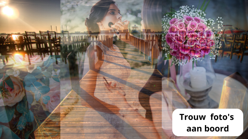 - Op het dek: Het bruidspaar poseert tegen de reling met het uitgestrekte water op de achtergrond, terwijl de fotograaf speelt met de lichtinval en de weerspiegeling in het water.